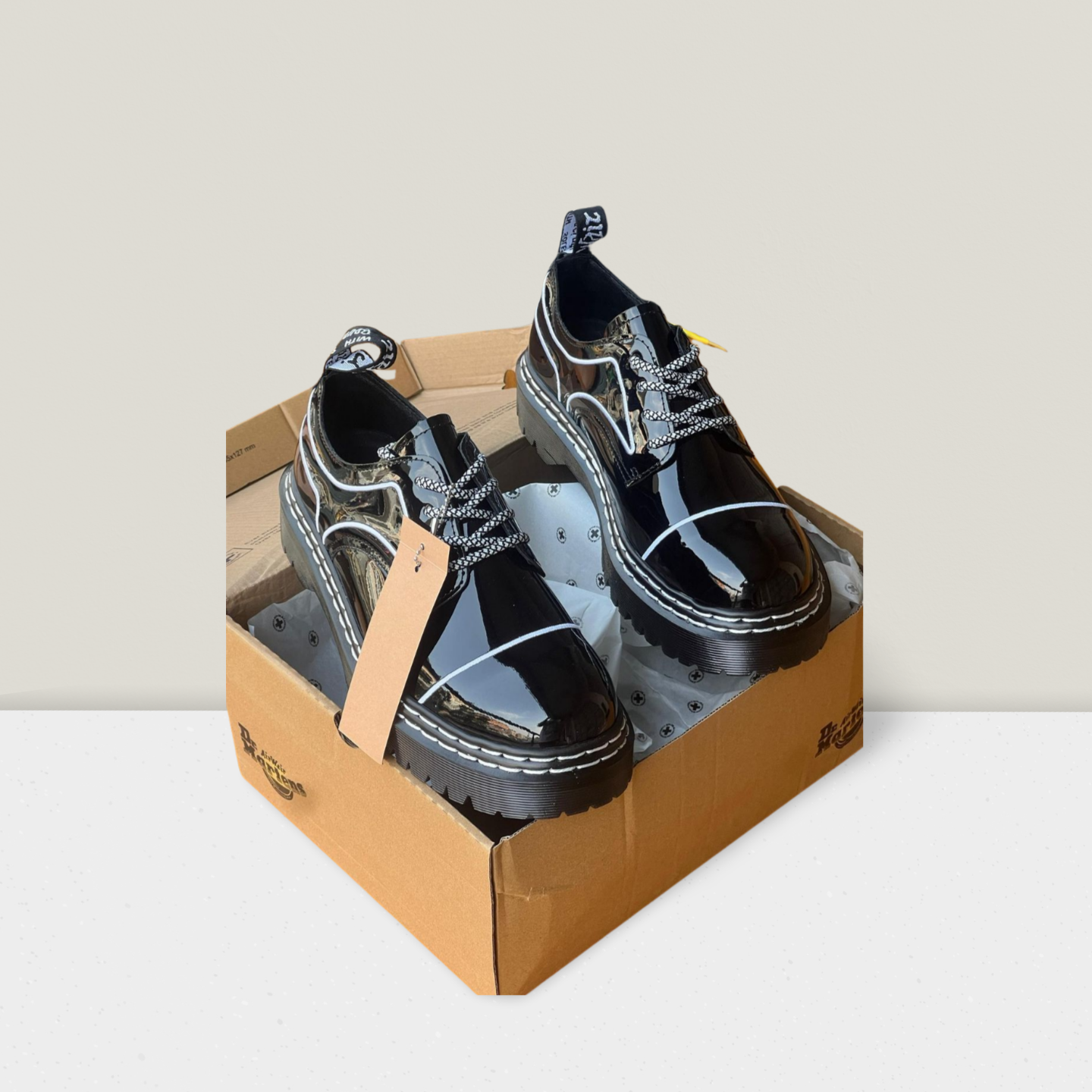 - Glossy black patent upper