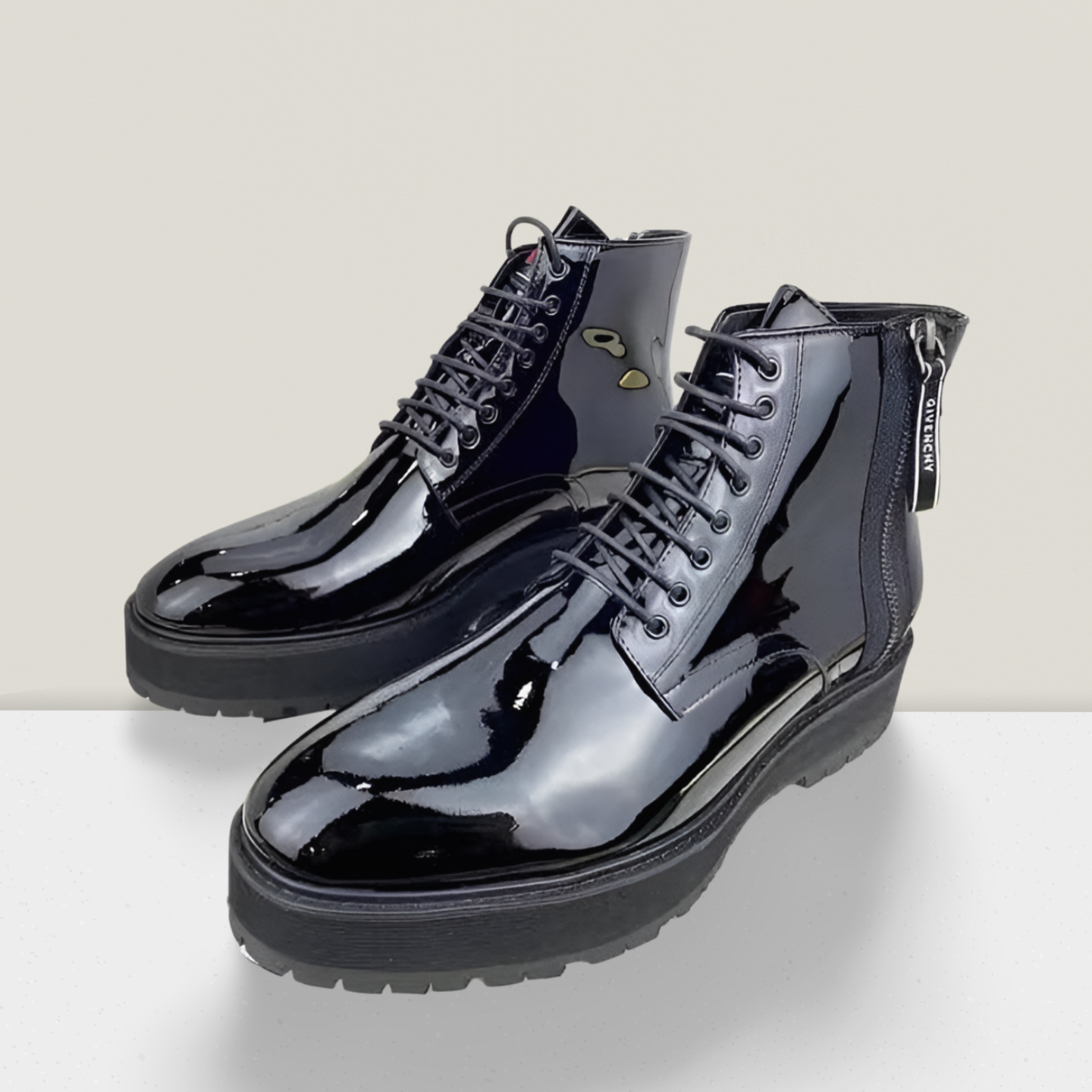 This luxury patent leather combat boot is crafted for men who want a bold, confident statement, combining a high-gloss finish with rugged structure and modern elegance.